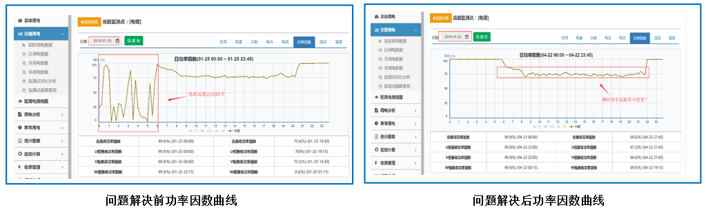 通過系統(tǒng)的實時監(jiān)測及分析,發(fā)現(xiàn)用戶整體功率因數(shù)在合格門限值之上,但電鍍監(jiān)測點W相功率因數(shù)偏低且波動較大。于是對生產工藝及末端供電設備進行排查定位,發(fā)現(xiàn)整流柜W相母線松動,并有局部燒灼痕跡。于是夜間進行緊急維護檢修,對整流柜、整流控制柜、交流吸收柜的鉚接處分別進行二次緊固和除塵,消除安全隱患,保障了安全生產。