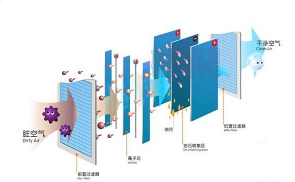 該油煙凈化器為二級(jí)式靜電吸附型,用來去除細(xì)微粒徑的碳氧化合物盒其他空氣中的雜粒。二級(jí)式是指靜電模塊分為電離區(qū)和集塵區(qū),電離區(qū)由多根鎢鋼絲或尖刺極板組成,安裝在接地板中間,并通入高壓直流電。大氣中的微粒在通過電離區(qū)的強(qiáng)力靜電場(chǎng)時(shí),被電離并帶有正或負(fù)電荷。集塵區(qū)則由大量平行板組成,通入低壓直流電(極性同電離區(qū)一致,但電壓減半)以形成電場(chǎng),帶電微粒被帶點(diǎn)極板排斥同時(shí)被接地極板吸引。如此,空氣中的雜質(zhì)顆粒會(huì)被有效去除。